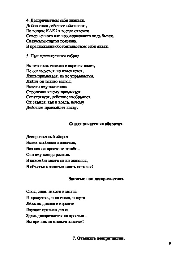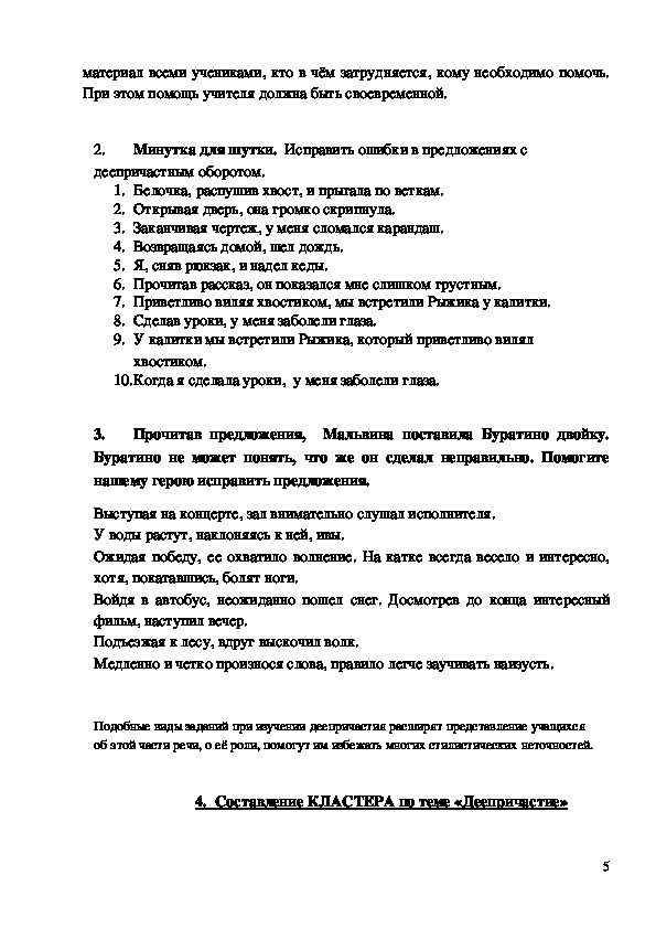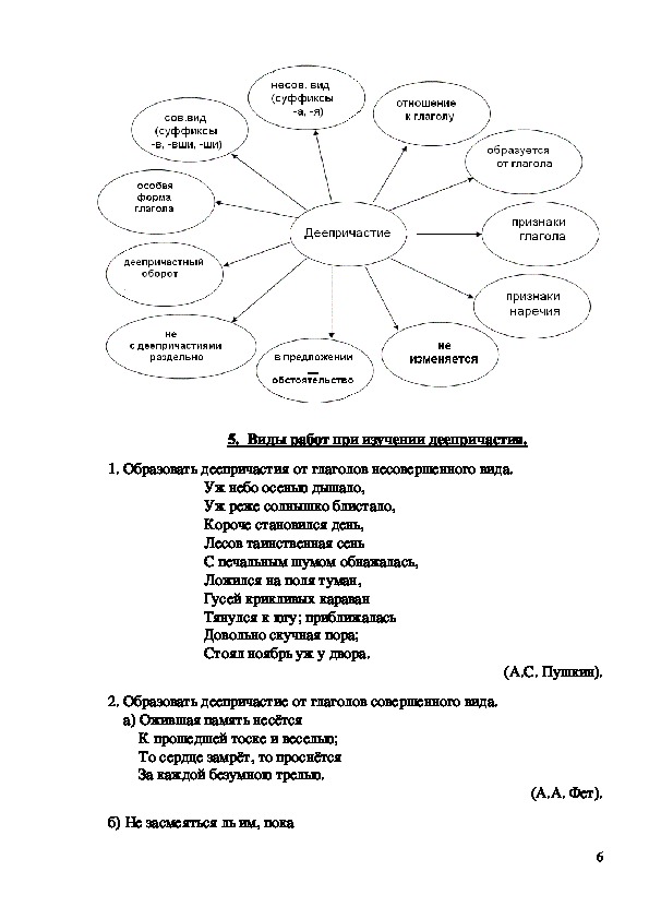 Методические материалы включают в себя различные виды работ при изучении деепричастия в 6 классе: алгоритмы, кластеры, правила в стихах, тексты для диктантов, сказки о деепричастии и др.1. Деепричастие и его правописание.