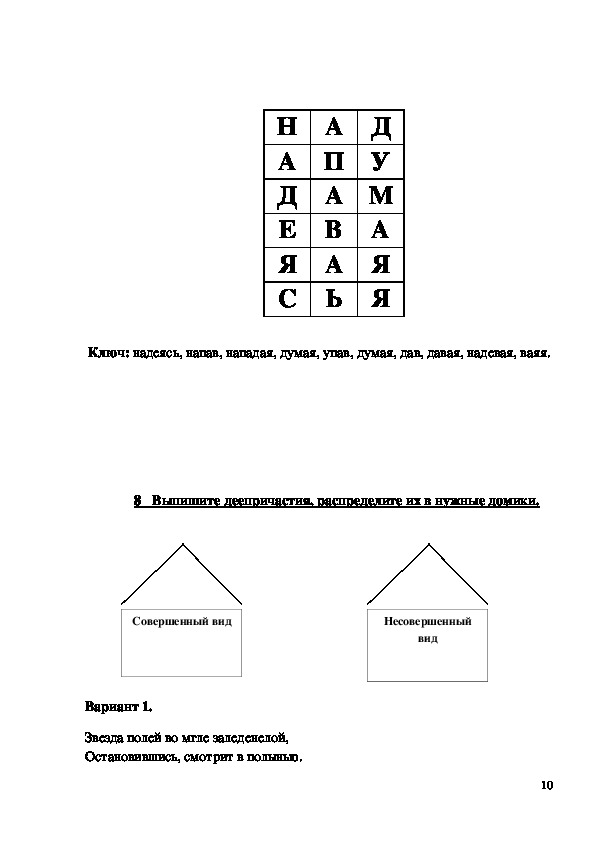 8 Выпишите деепричастия, распределите их в нужные домики.