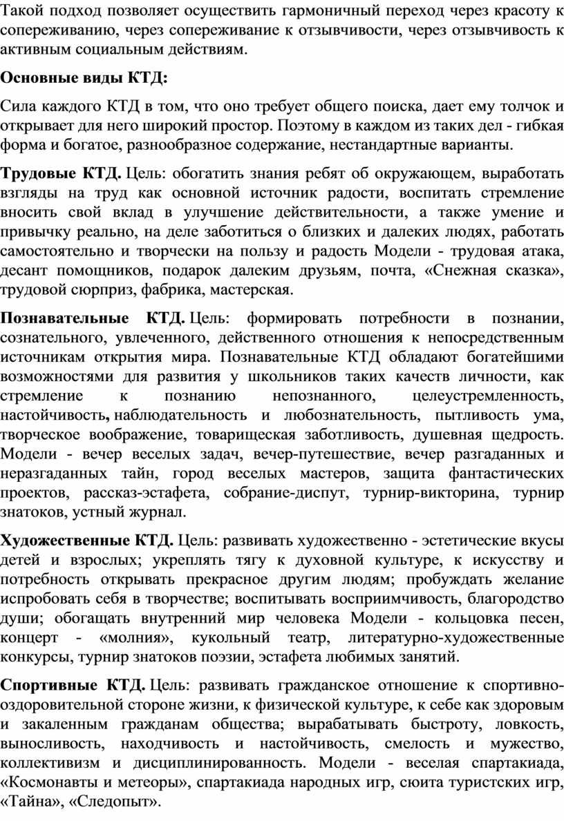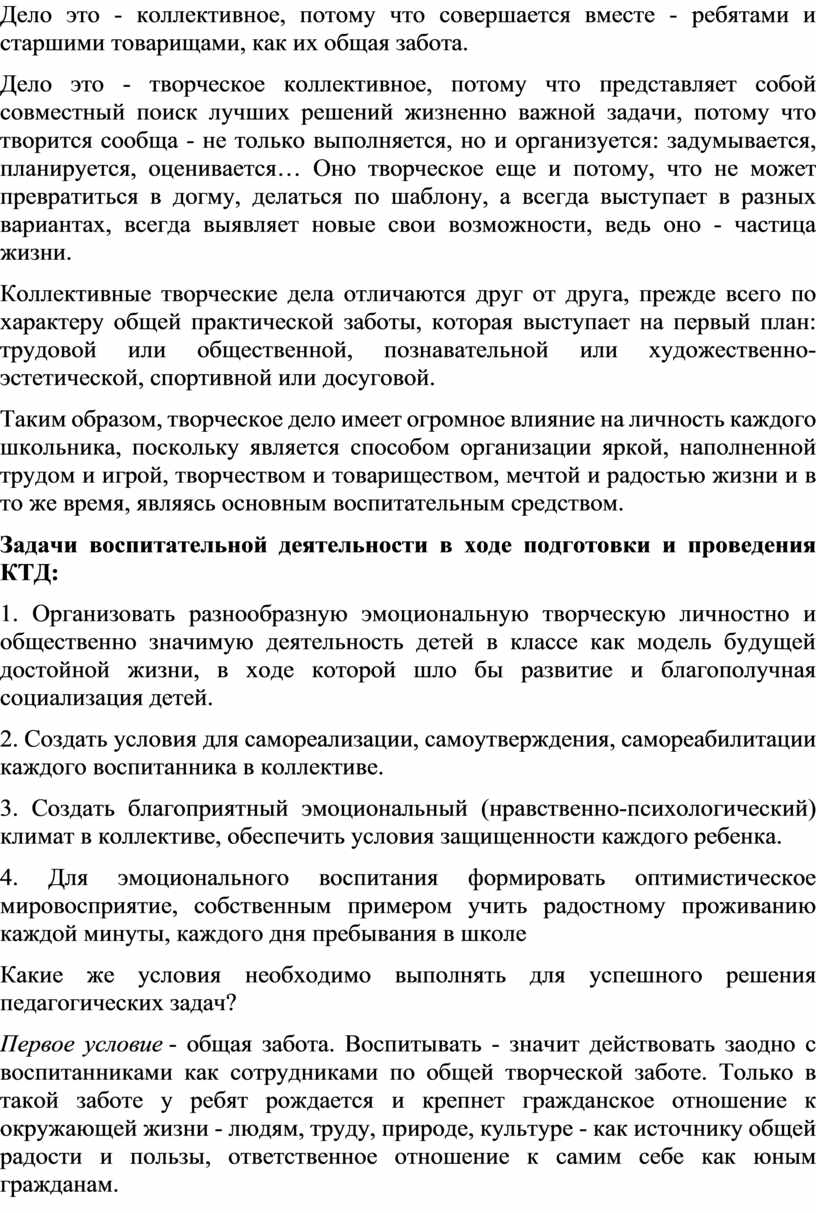 Каждое КТД - это, прежде всего проявление жизненно-практической гражданской заботы об улучшении общей жизни. Это совокупность определенных действий на общую пользу и радость. В таком процессе, направляемом товарищеской воспитательной заботой педагогов, осуществляется нравственное, умственное, физическое, трудовое, эстетическое воспитание, в теснейшем единстве происходит развитие всех сторон личности: познавательно - мировоззренческой, эмоционально-волевой, действенной.