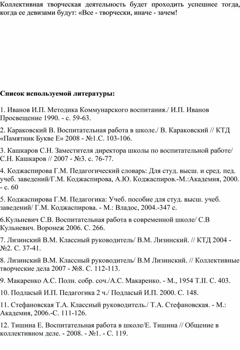 1. Иванов И.П. Методика Коммунарского воспитания./ И.П. Иванов Просвещение 1990. - с. 59-63.