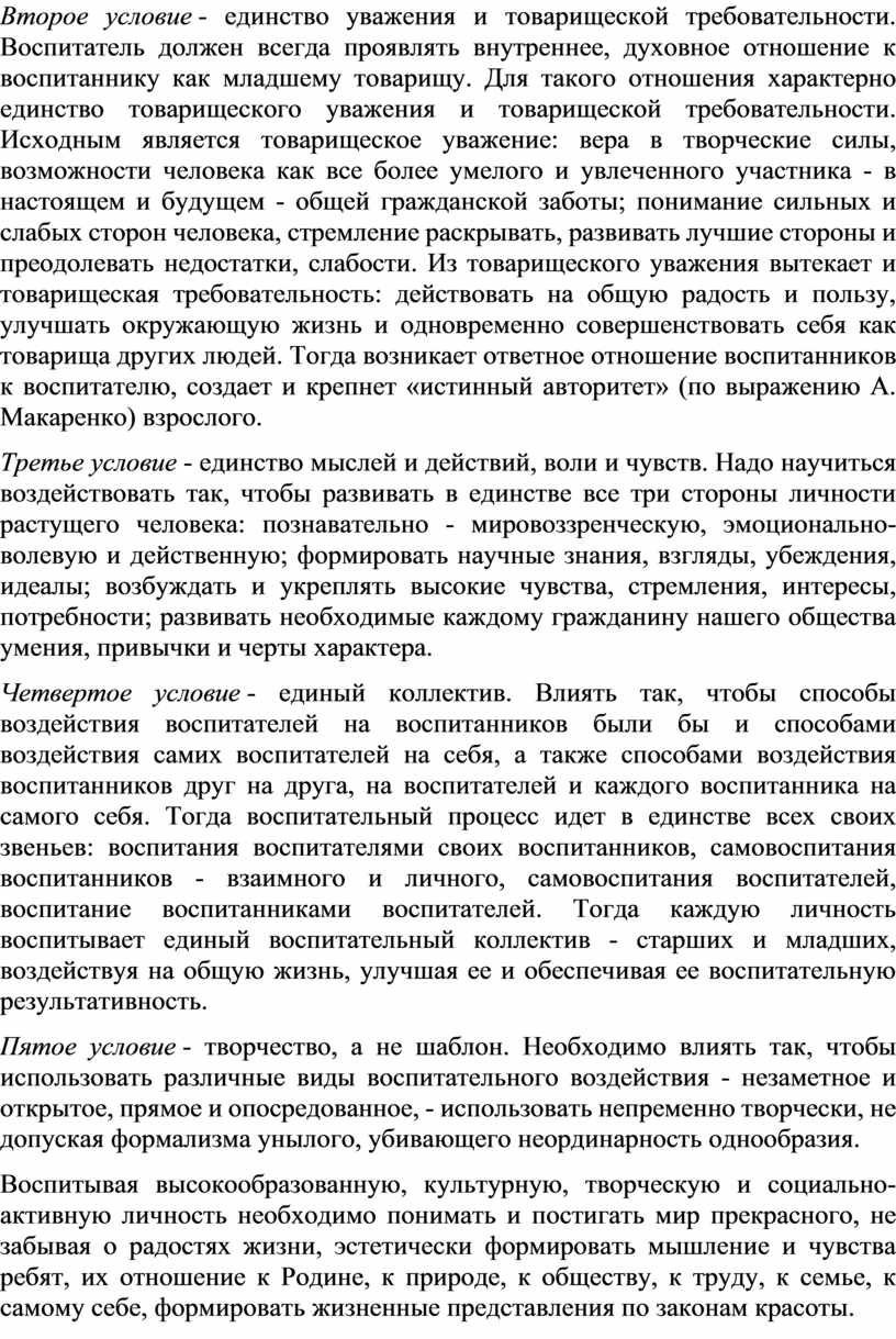 Четвертое условие - единый коллектив. Влиять так, чтобы способы воздействия воспитателей на воспитанников были бы и способами воздействия самих воспитателей на себя, а также способами воздействия воспитанников друг на друга, на воспитателей и каждого воспитанника на самого себя. Тогда воспитательный процесс идет в единстве всех своих звеньев: воспитания воспитателями своих воспитанников, самовоспитания воспитанников - взаимного и личного, самовоспитания воспитателей, воспитание воспитанниками воспитателей. Тогда каждую личность воспитывает единый воспитательный коллектив - старших и младших, воздействуя на общую жизнь, улучшая ее и обеспечивая ее воспитательную результативность.