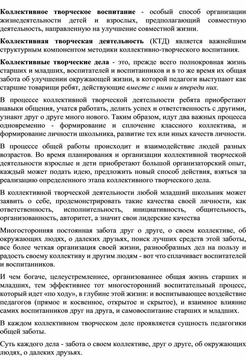 Коллективные творческие дела - это, прежде всего полнокровная жизнь старших и младших, воспитателей и воспитанников и в то же время их общая забота об улучшении окружающей жизни, в которой педагоги выступают как старшие товарищи ребят, действующие вместе с ними и впереди них.