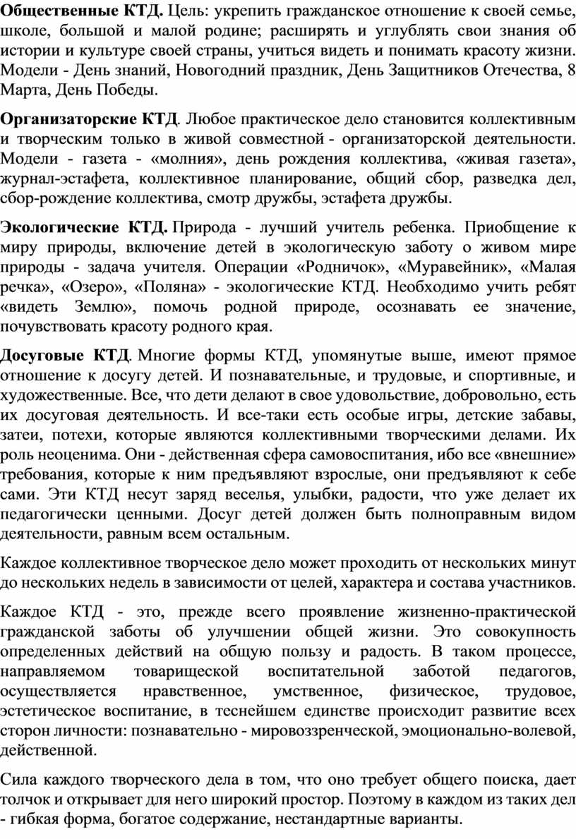 Коллективная творческая деятельность (КТД) является важнейшим структурным компонентом методики коллективно-творческого воспитания.