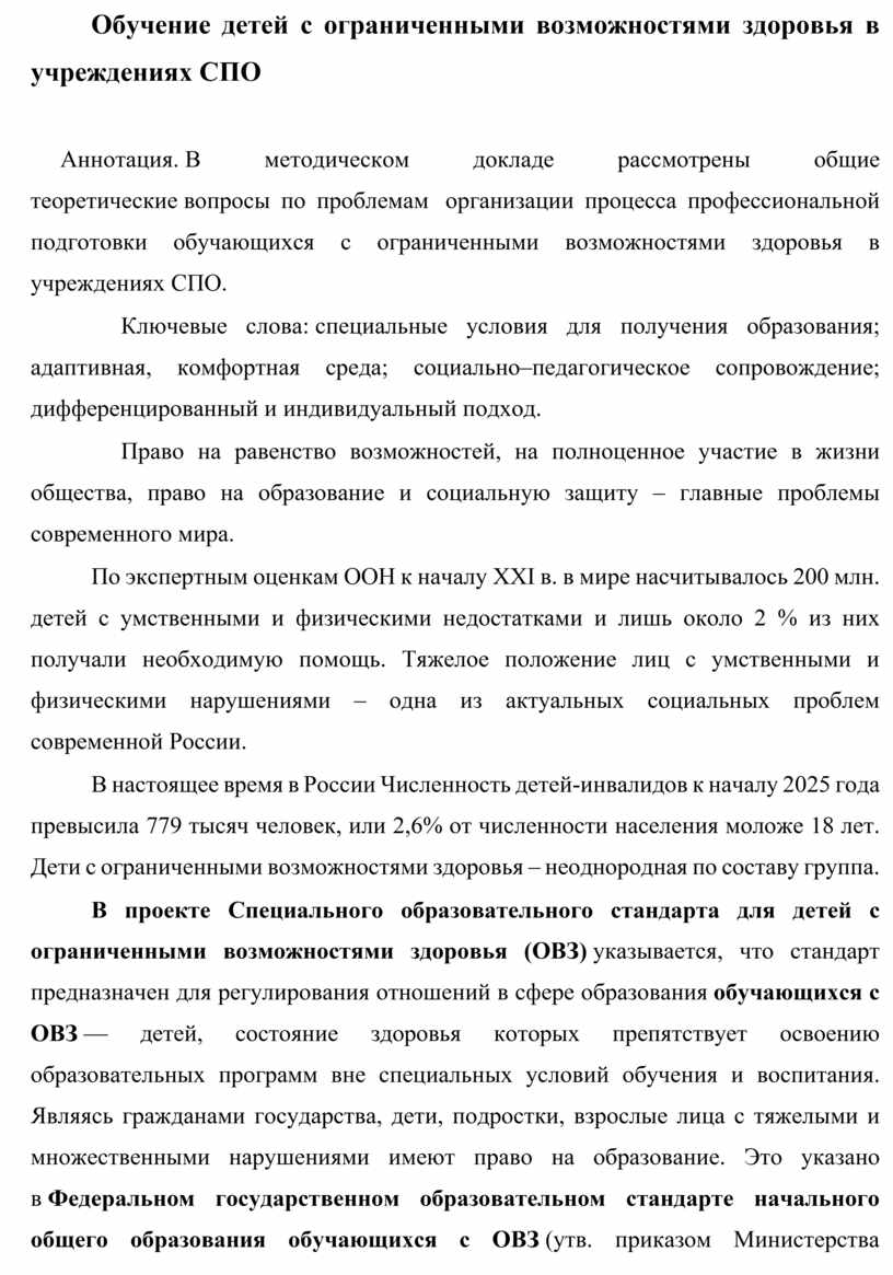 Обучение детей с ограниченными возможностями здоровья в учреждениях СПО