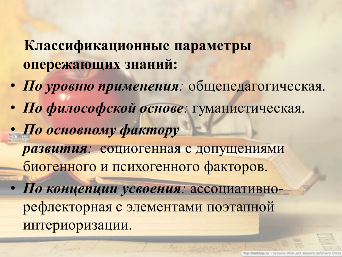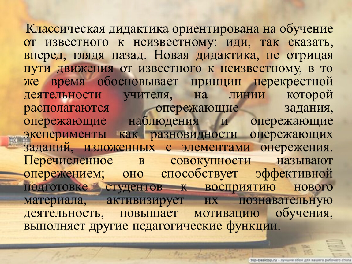 Классическая дидактика ориентирована на обучение от известного к неизвестному: иди, так сказать, вперед, глядя назад. Новая дидактика, не отрицая пути движения от известного к неизвестному, в то же время обосновывает принцип перекрестной деятельности учителя, на линии которой располагаются опережающие задания, опережающие наблюдения и опережающие эксперименты как разновидности опережающих заданий, изложенных с элементами опережения. Перечисленное в совокупности называют опережением; оно способствует эффективной подготовке студентов к восприятию нового материала, активизирует их познавательную деятельность, повышает мотивацию обучения, выполняет другие педагогические функции.