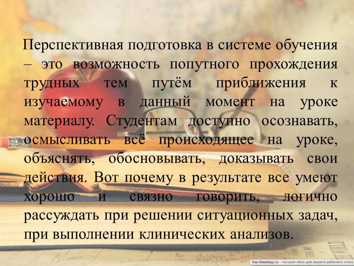 Перспективная подготовка в системе обучения – это возможность попутного прохождения трудных тем путём приближения к изучаемому в данный момент на уроке материалу. Студентам доступно осознавать, осмысливать всё происходящее на уроке, объяснять, обосновывать, доказывать свои действия. Вот почему в результате все умеют хорошо и связно говорить, логично рассуждать при решении ситуационных задач, при выполнении клинических анализов.