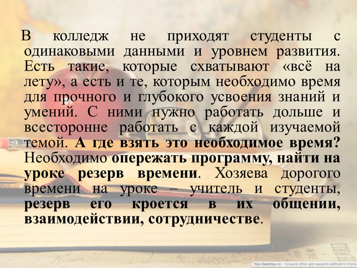 В колледж не приходят студенты с одинаковыми данными и уровнем развития. Есть такие, которые схватывают «всё на лету», а есть и те, которым необходимо время для прочного и глубокого усвоения знаний и умений. С ними нужно работать дольше и всесторонне работать с каждой изучаемой темой. А где взять это необходимое время? Необходимо опережать программу, найти на уроке резерв времени. Хозяева дорогого времени на уроке – учитель и студенты, резерв его кроется в их общении, взаимодействии, сотрудничестве.