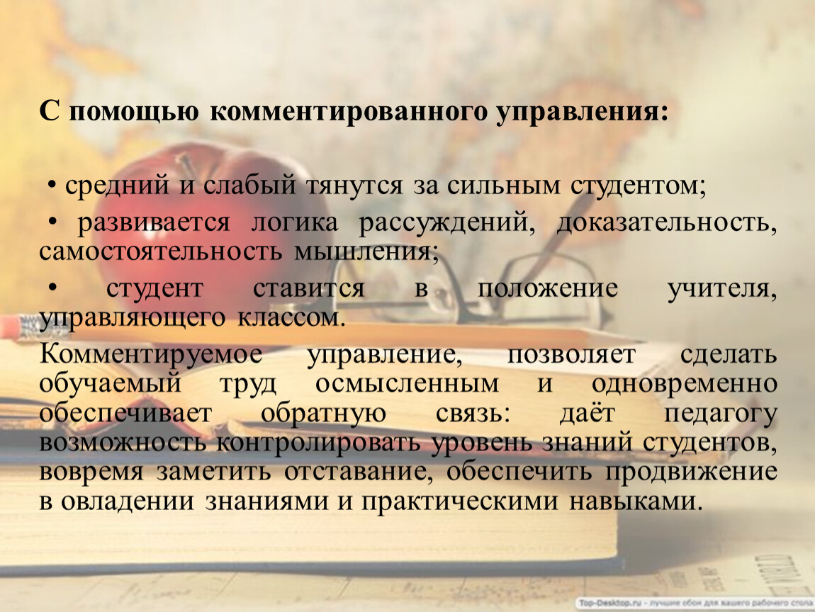 Комментируемое управление, позволяет сделать обучаемый труд осмысленным и одновременно обеспечивает обратную связь: даёт педагогу возможность контролировать уровень знаний студентов, вовремя заметить отставание, обеспечить продвижение в овладении знаниями и практическими навыками.