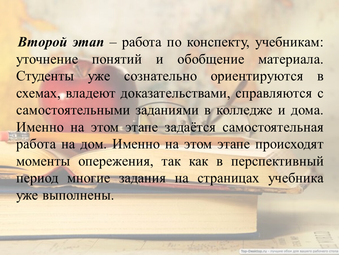 Второй этап – работа по конспекту, учебникам: уточнение понятий и обобщение материала. Студенты уже сознательно ориентируются в схемах, владеют доказательствами, справляются с самостоятельными заданиями в колледже и дома. Именно на этом этапе задаётся самостоятельная работа на дом. Именно на этом этапе происходят моменты опережения, так как в перспективный период многие задания на страницах учебника уже выполнены.