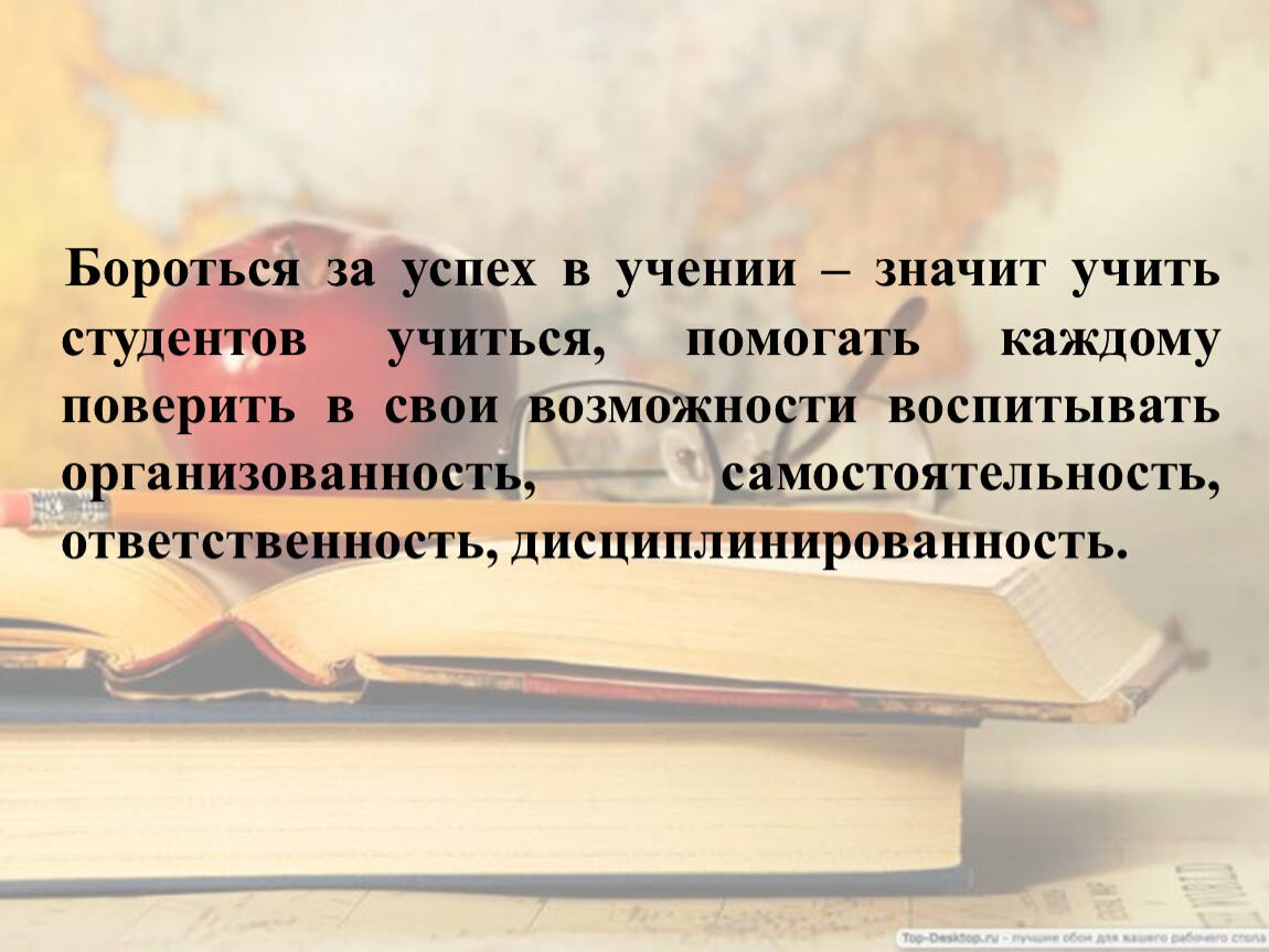 Бороться за успех в учении – значит учить студентов учиться, помогать каждому поверить в свои возможности воспитывать организованность, самостоятельность, ответственность, дисциплинированность.