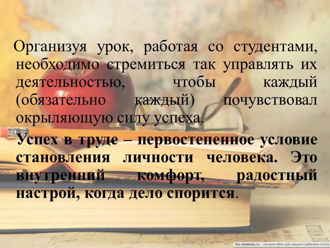 Организуя урок, работая со студентами, необходимо стремиться так управлять их деятельностью, чтобы каждый (обязательно каждый) почувствовал окрыляющую силу успеха.