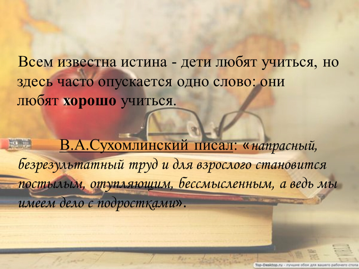 В.А.Сухомлинский писал: «напрасный, безрезультатный труд и для взрослого становится постылым, отупляющим, бессмысленным, а ведь мы имеем дело с подростками».
