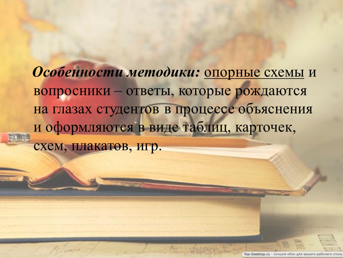 Особенности методики: опорные схемы и вопросники – ответы, которые рождаются на глазах студентов в процессе объяснения и оформляются в виде таблиц, карточек, схем, плакатов, игр.