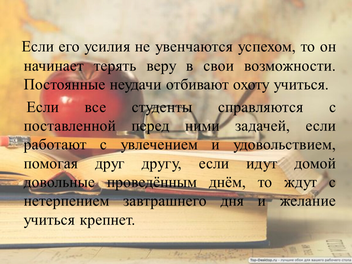 Если все студенты справляются с поставленной перед ними задачей, если работают с увлечением и удовольствием, помогая друг другу, если идут домой довольные проведённым днём, то ждут с нетерпением завтрашнего дня и желание учиться крепнет.