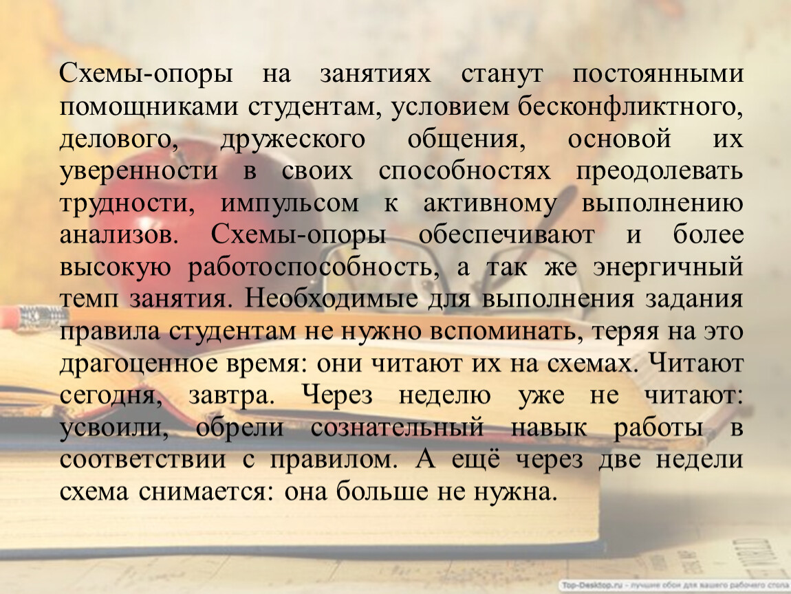 Схемы-опоры на занятиях станут постоянными помощниками студентам, условием бесконфликтного, делового, дружеского общения, основой их уверенности в своих способностях преодолевать трудности, импульсом к активному выполнению анализов. Схемы-опоры обеспечивают и более высокую работоспособность, а так же энергичный темп занятия. Необходимые для выполнения задания правила студентам не нужно вспоминать, теряя на это драгоценное время: они читают их на схемах. Читают сегодня, завтра. Через неделю уже не читают: усвоили, обрели сознательный навык работы в соответствии с правилом. А ещё через две недели схема снимается: она больше не нужна.
