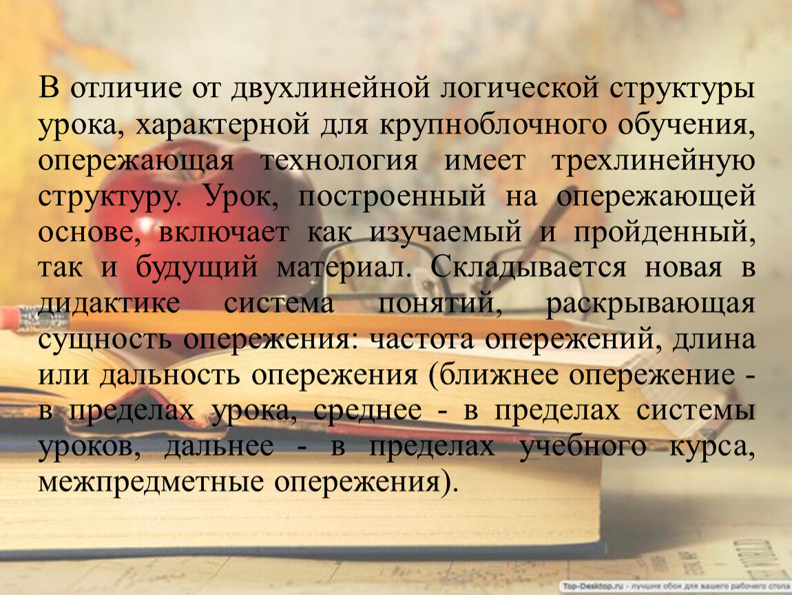 В отличие от двухлинейной логической структуры урока, характерной для крупноблочного обучения, опережающая технология имеет трехлинейную структуру. Урок, построенный на опережающей основе, включает как изучаемый и пройденный, так и будущий материал. Складывается новая в дидактике система понятий, раскрывающая сущность опережения: частота опережений, длина или дальность опережения (ближнее опережение - в пределах урока, среднее - в пределах системы уроков, дальнее - в пределах учебного курса, межпредметные опережения).