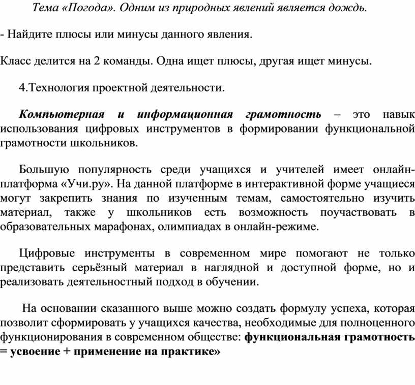 На основании сказанного выше можно создать формулу успеха, которая позволит сформировать у учащихся качества, необходимые для полноценного функционирования в современном обществе: функциональная грамотность = усвоение + применение на практике»
