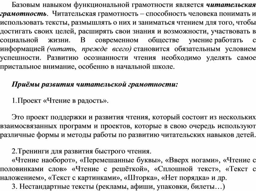 Базовым навыком функциональной грамотности является читательская грамотность. Читательская грамотность – способность человека понимать и использовать тексты, размышлять о них и заниматься чтением для того, чтобы достигать своих целей, расширять свои знания и возможности, участвовать в социальной жизни. В современном обществе умение работать с информацией (читать, прежде всего) становится обязательным условием успешности. Развитию осознанности чтения необходимо уделять самое пристальное внимание, особенно в начальной школе.