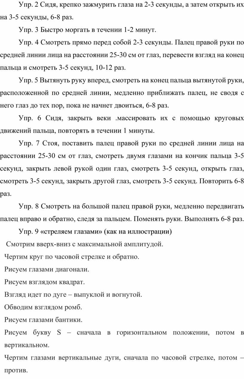 Упр. 7 Стоя, поставить палец правой руки по средней линии лица на расстоянии 25-30 см от глаз, смотреть двумя глазами на кончик пальца 3-5 секунд, закрыть левой рукой один глаз, смотреть 3-5 секунд, открыть глаз, смотреть 3-5 секунд, закрыть другой глаз, смотреть 3-5 секунд. Повторить 6-8 раз.