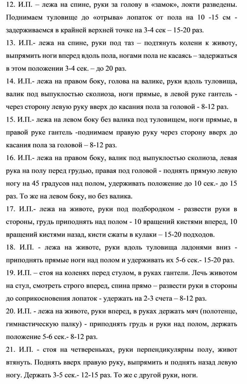 14. И.П.- лежа на правом боку, голова на валике, руки вдоль туловища, валик под выпуклостью сколиоза, ноги прямые, в левой руке гантель - через сторону левую руку вверх до касания пола за головой - 8-12 раз.