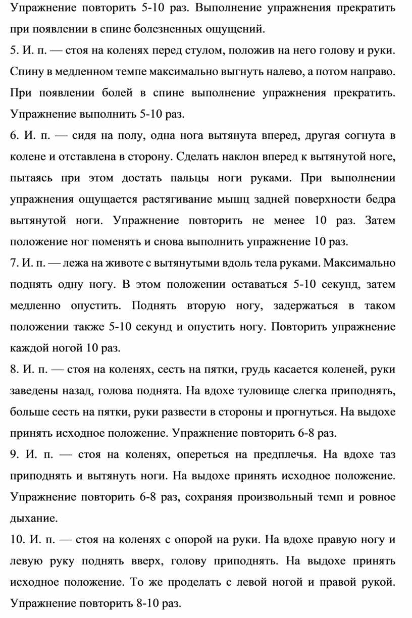 5. И. п. — стоя на коленях перед стулом, положив на него голову и руки. Спину в медленном темпе максимально выгнуть налево, а потом направо. При появлении болей в спине выполнение упражнения прекратить. Упражнение выполнить 5-10 раз.
