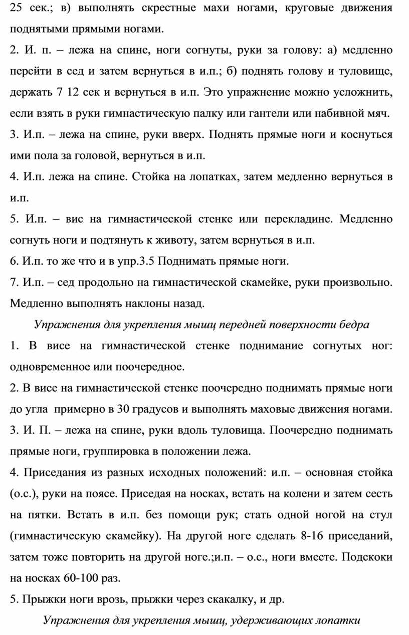 1.И.п. лежа на спине, поясницу прижать к полу. а) медленно сгибать-разгибать ноги, отрывая стопы от пола; б) поднять обе ноги и держать 15-25 сек.; в) выполнять скрестные махи ногами, круговые движения поднятыми прямыми ногами.
