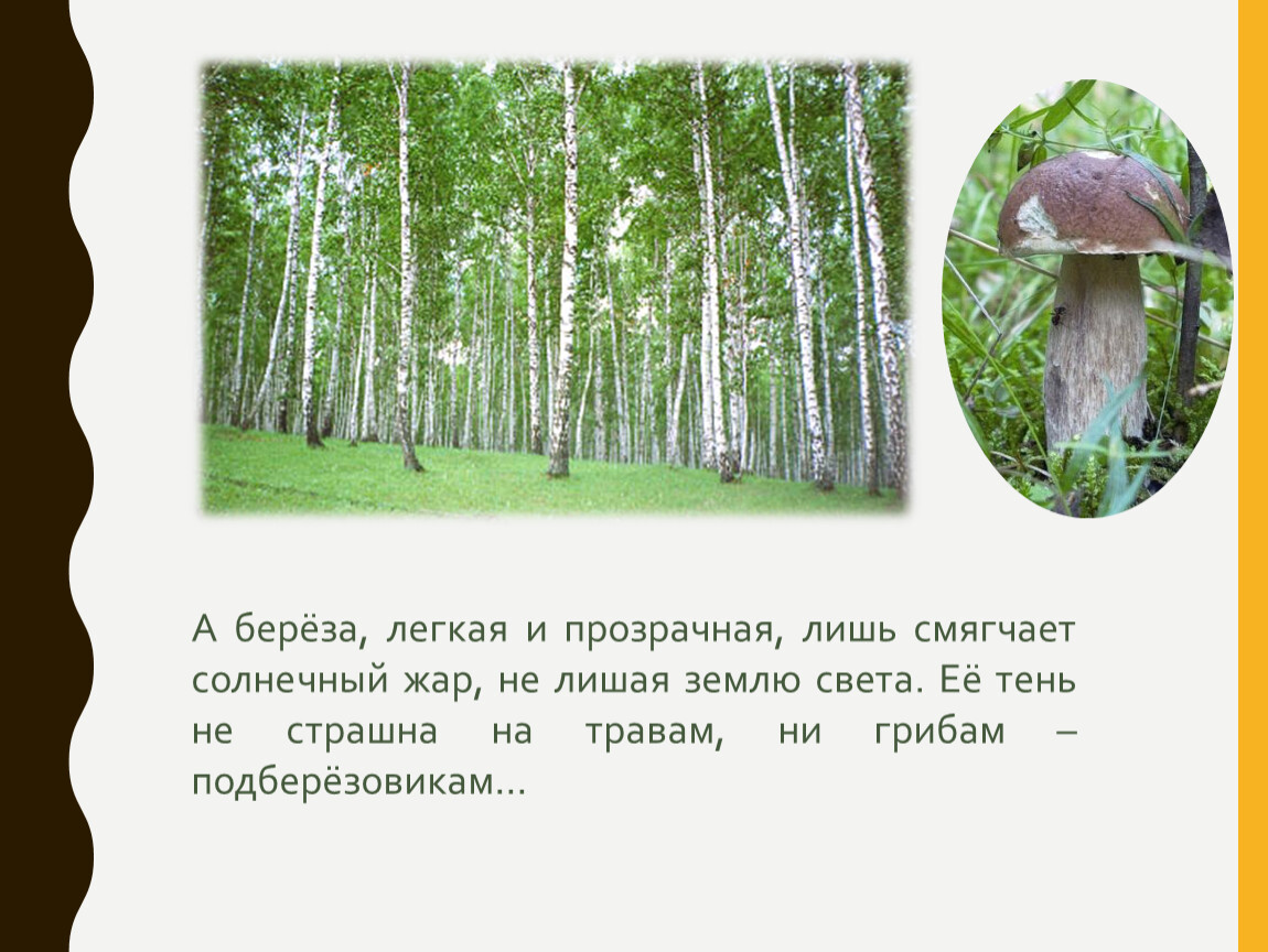 А берёза, легкая и прозрачная, лишь смягчает солнечный жар, не лишая землю света. Её тень не страшна на травам, ни грибам – подберёзовикам…