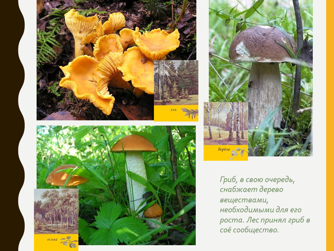 Гриб, в свою очередь, снабжает дерево веществами, необходимыми для его роста. Лес принял гриб в соё сообщество.