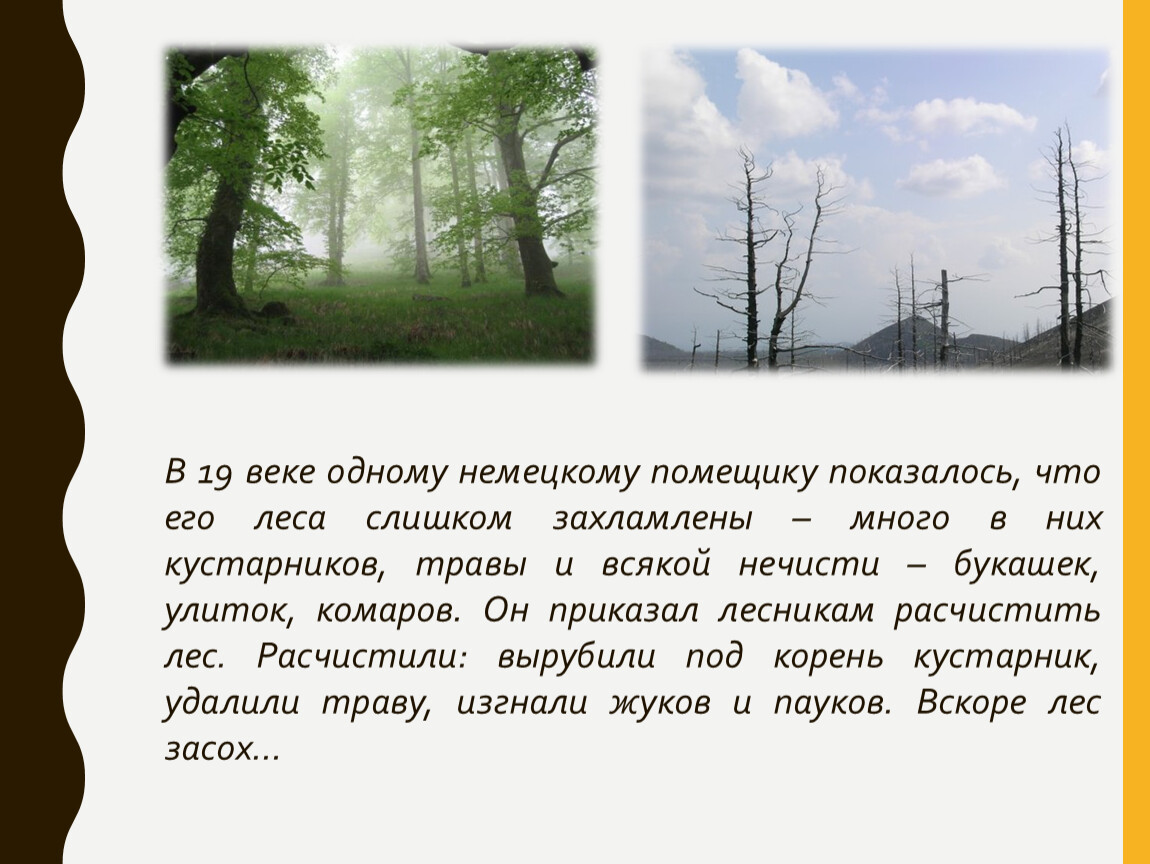 В 19 веке одному немецкому помещику показалось, что его леса слишком захламлены – много в них кустарников, травы и всякой нечисти – букашек, улиток, комаров. Он приказал лесникам расчистить лес. Расчистили: вырубили под корень кустарник, удалили траву, изгнали жуков и пауков. Вскоре лес засох…