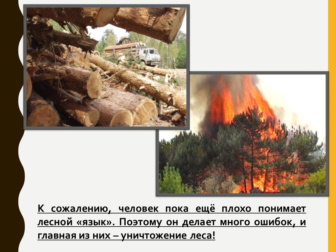 К сожалению, человек пока ещё плохо понимает лесной «язык». Поэтому он делает много ошибок, и главная из них – уничтожение леса!