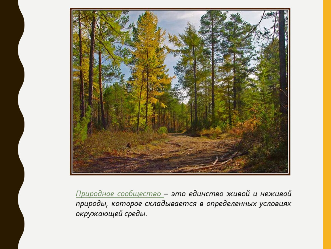Природное сообщество – это единство живой и неживой природы, которое складывается в определенных условиях окружающей среды.