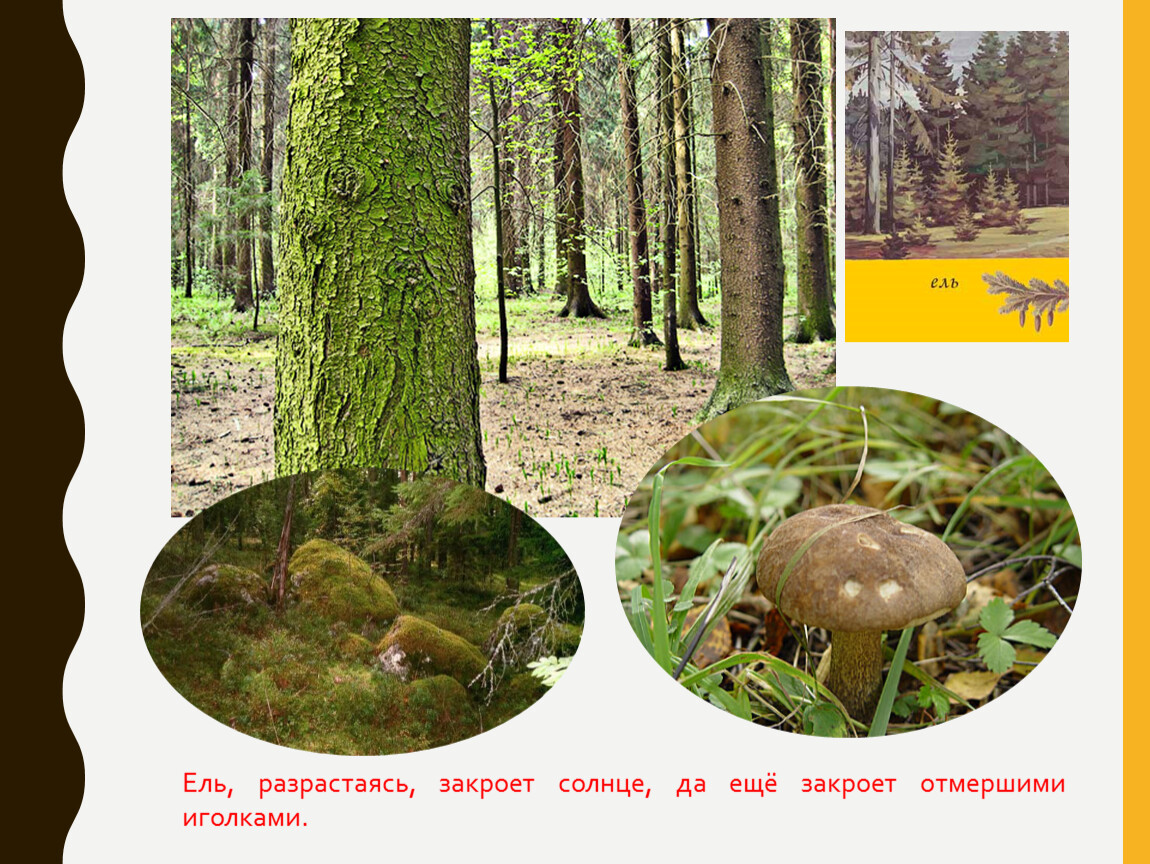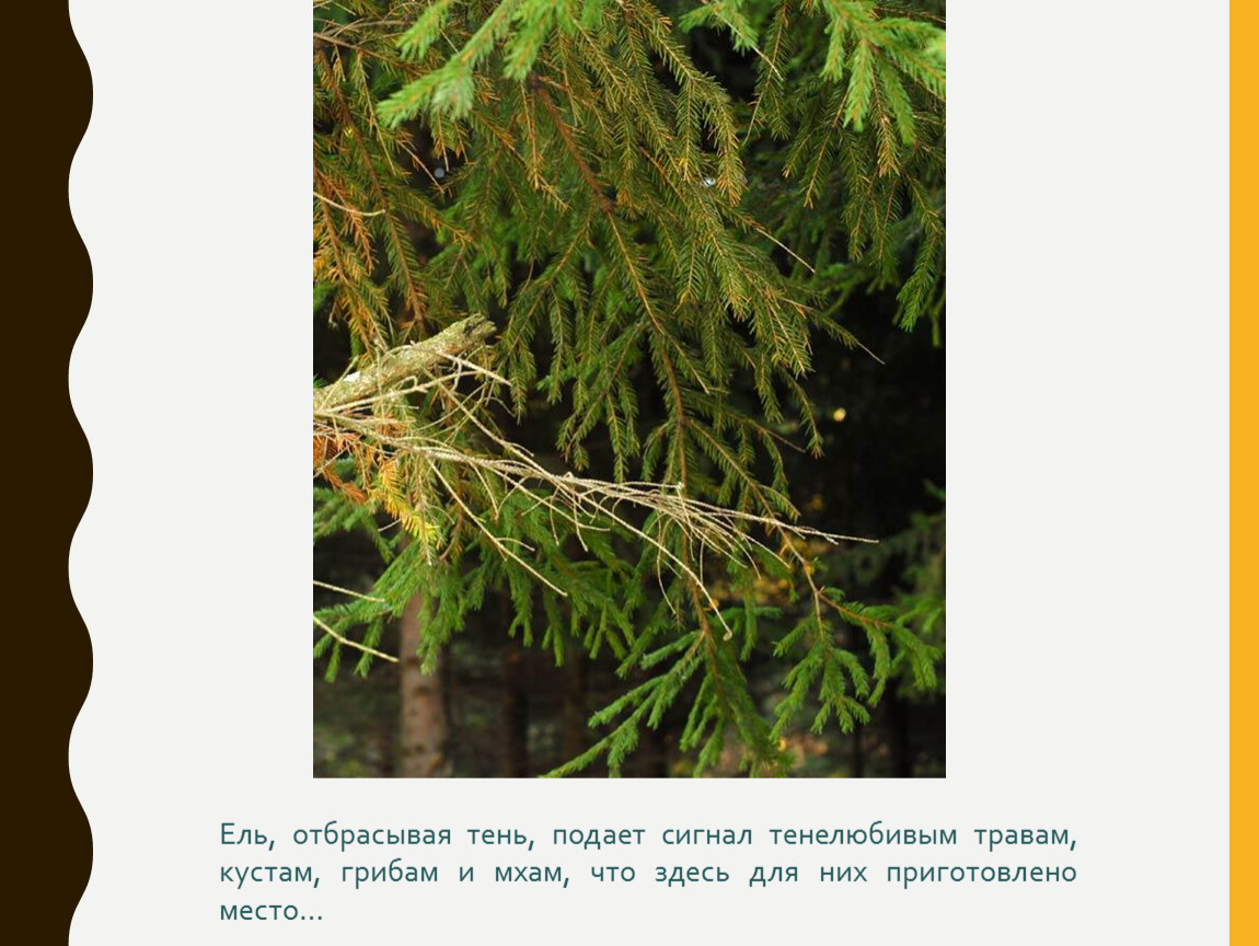 Ель, отбрасывая тень, подает сигнал тенелюбивым травам, кустам, грибам и мхам, что здесь для них приготовлено место…
