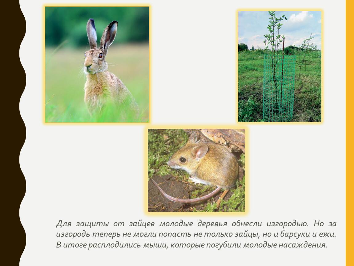 Для защиты от зайцев молодые деревья обнесли изгородью. Но за изгородь теперь не могли попасть не только зайцы, но и барсуки и ежи. В итоге расплодились мыши, которые погубили молодые насаждения.