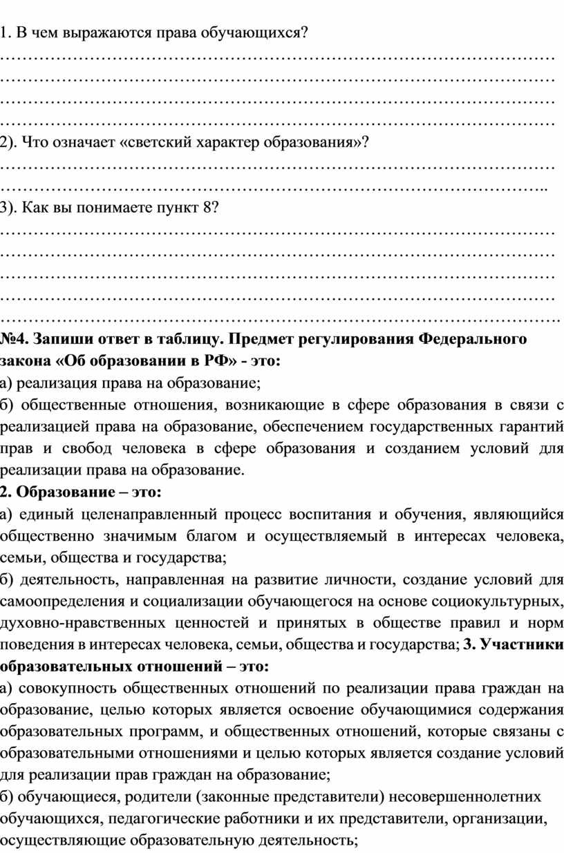№4. Запиши ответ в таблицу. Предмет регулирования Федерального закона «Об образовании в РФ» - это: