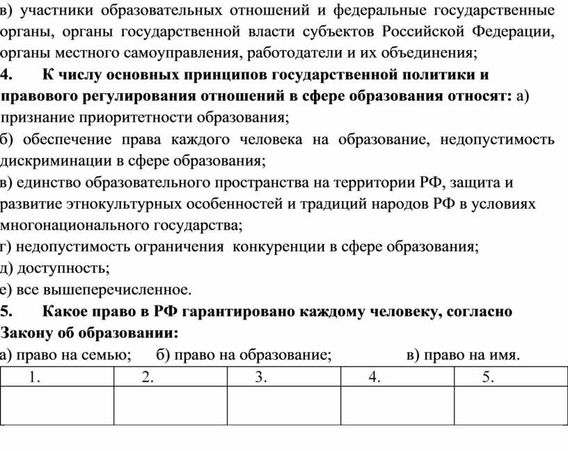 4. К числу основных принципов государственной политики и правового регулирования отношений в сфере образования относят: а) признание приоритетности образования;