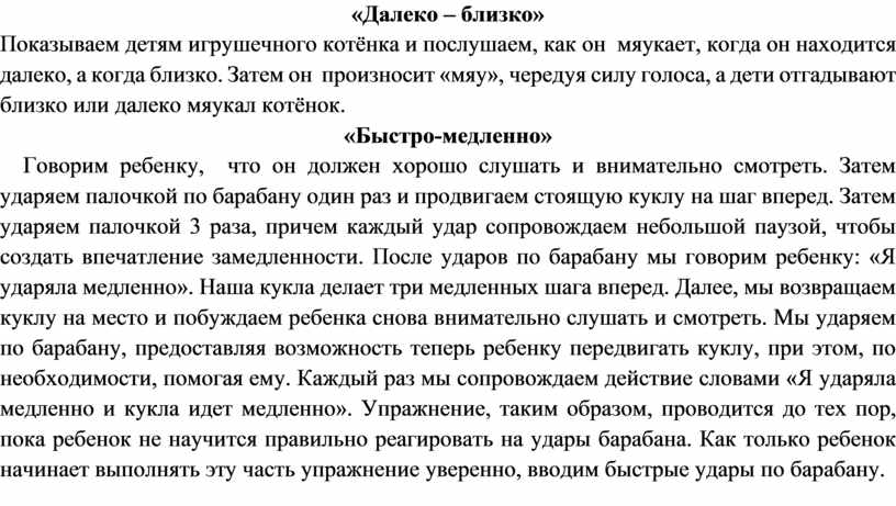 Показываем детям игрушечного котёнка и послушаем, как он мяукает, когда он находится далеко, а когда близко. Затем он произносит «мяу», чередуя силу голоса, а дети отгадывают близко или далеко мяукал котёнок.