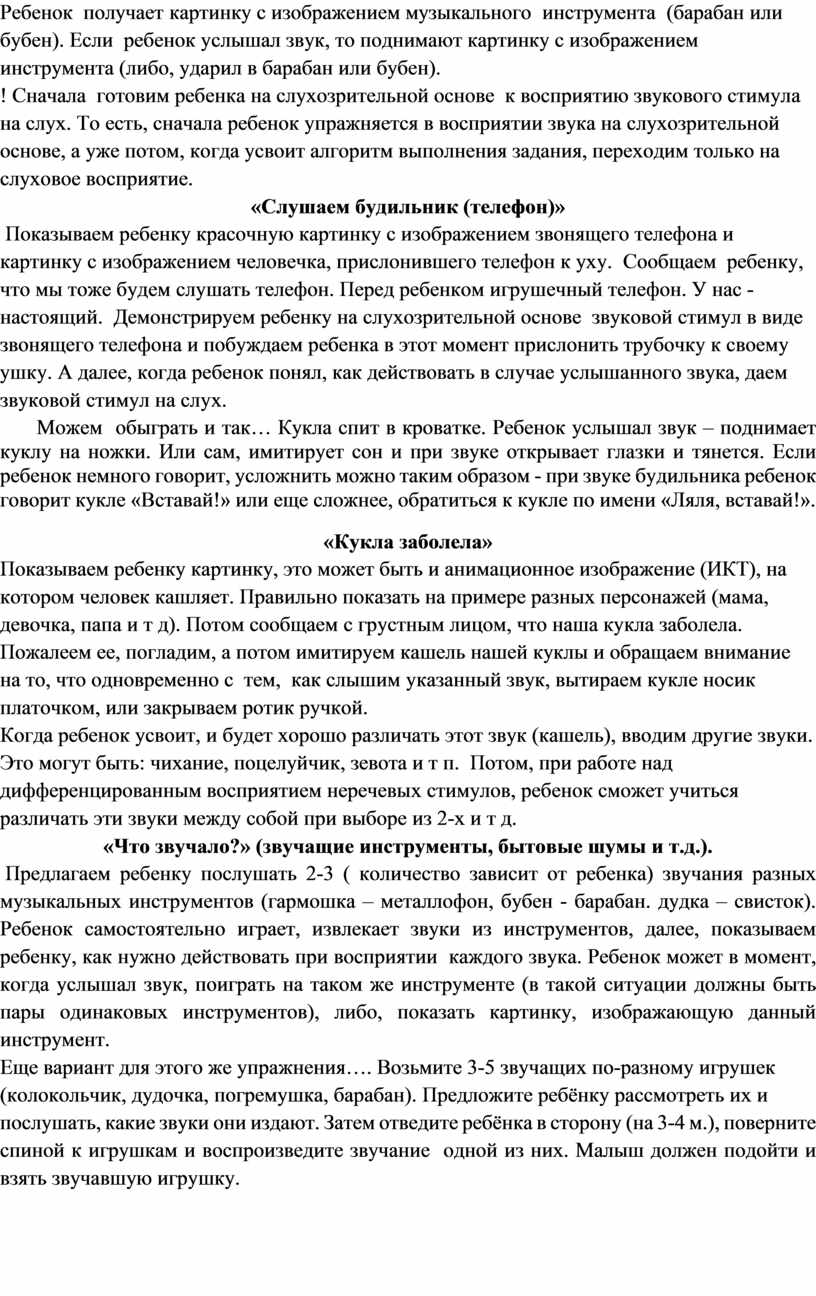 ! Сначала готовим ребенка на слухозрительной основе к восприятию звукового стимула на слух. То есть, сначала ребенок упражняется в восприятии звука на слухозрительной основе, а уже потом, когда усвоит алгоритм выполнения задания, переходим только на слуховое восприятие.
