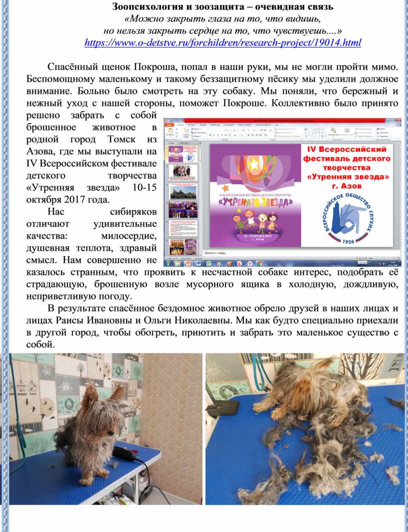 Но эти слова не про нас – дружных ребят. Мы учимся в ОГБОУ «Школа-интерната для обучающихся с нарушениями слуха». Мы – сибиряки, поэтому не прошли мимо беды, спасли маленького беззащитного пёсика в далёком городе Азове, куда приехали на IV Всероссийский фестиваль детского творчества «Утренняя звезда». Об этом наша печальная история, которая имеет счастливый конец.