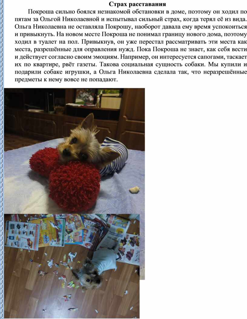 Покроша сильно боялся незнакомой обстановки в доме, поэтому он ходил по пятам за Ольгой Николаевной и испытывал сильный страх, когда терял её из вида. Ольга Николаевна не оставляла Покрошу, наоборот давала ему время успокоиться и привыкнуть. На новом месте Покроша не понимал границу нового дома, поэтому ходил в туалет на пол. Привыкнув, он уже перестал рассматривать эти места как места, разрешённые для оправления нужд. Пока Покроша не знает, как себя вести и действует согласно своим эмоциям. Например, он интересуется сапогами, таскает их по квартире, рвёт газеты. Такова социальная сущность собаки. Мы купили и подарили собаке игрушки, а Ольга Николаевна сделала так, что неразрешённые предметы к нему вовсе не попадают.