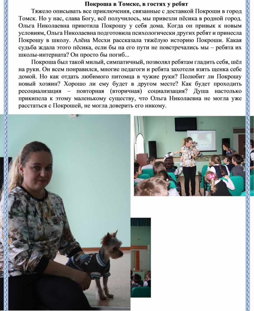 Тяжело описывать все приключения, связанные с доставкой Покроши в город Томск. Но у нас, слава Богу, всё получилось, мы привезли пёсика в родной город. Ольга Николаевна приютила Покрошу у себя дома. Когда он привык к новым условиям, Ольга Николаевна подготовила психологически других ребят и принесла Покрошу в школу. Алёна Месхи рассказала тяжёлую историю Покроши. Какая судьба ждала этого пёсика, если бы на его пути не повстречались мы – ребята их школы-интерната? Он просто бы погиб...