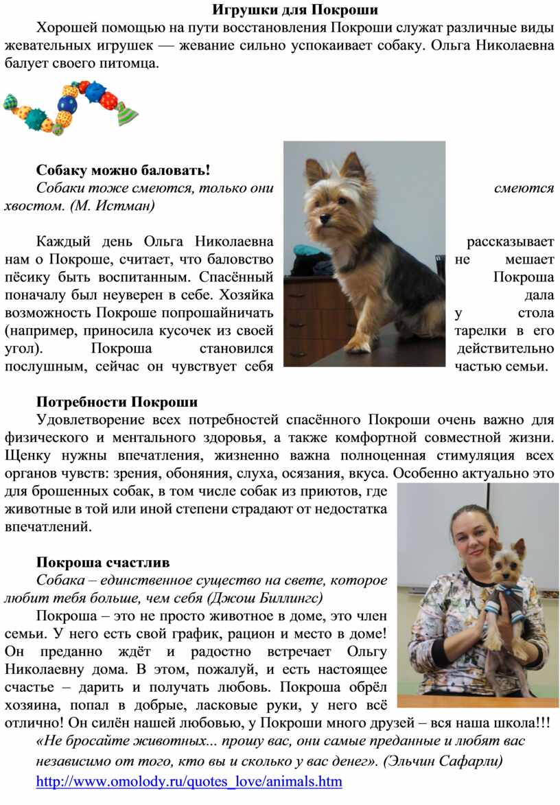 Каждый день Ольга Николаевна рассказывает нам о Покроше, считает, что баловство не мешает пёсику быть воспитанным. Спасённый Покроша поначалу был неуверен в себе. Хозяйка дала возможность Покроше попрошайничать у стола (например, приносила кусочек из своей тарелки в его угол). Покроша становился действительно послушным, сейчас он чувствует себя частью семьи.