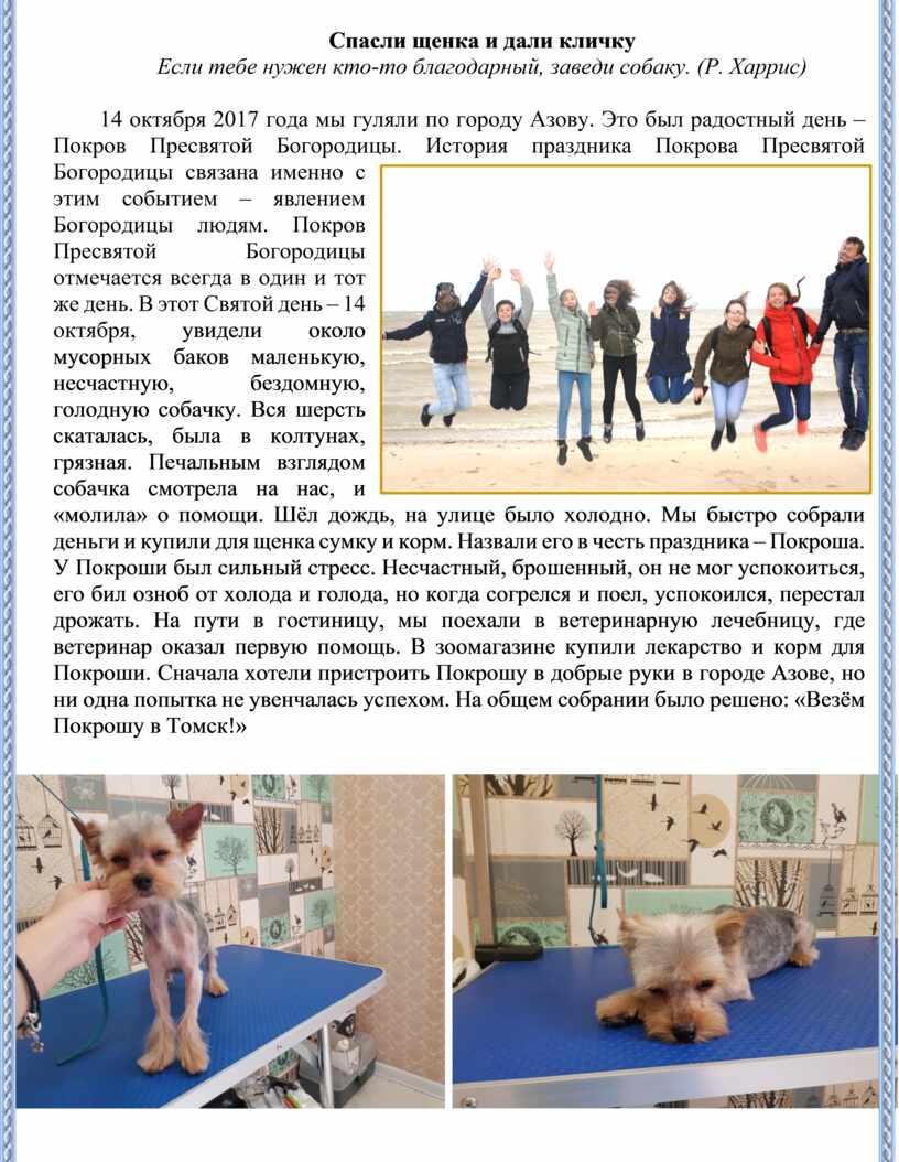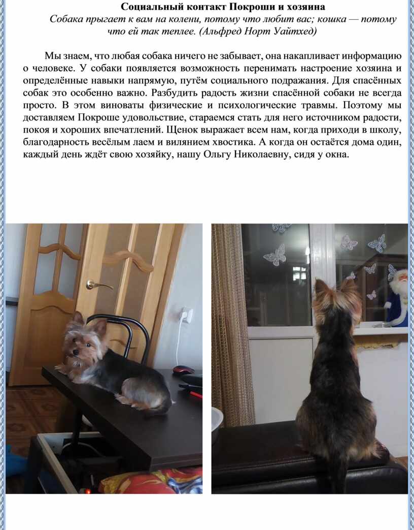 Мы знаем, что любая собака ничего не забывает, она накапливает информацию о человеке. У собаки появляется возможность перенимать настроение хозяина и определённые навыки напрямую, путём социального подражания. Для спасённых собак это особенно важно. Разбудить радость жизни спасённой собаки не всегда просто. В этом виноваты физические и психологические травмы. Поэтому мы доставляем Покроше удовольствие, стараемся стать для него источником радости, покоя и хороших впечатлений. Щенок выражает всем нам, когда приходи в школу, благодарность весёлым лаем и вилянием хвостика. А когда он остаётся дома один, каждый день ждёт свою хозяйку, нашу Ольгу Николаевну, сидя у окна.