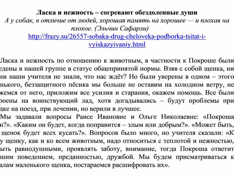 Мы задавали вопросы Раисе Ивановне и Ольге Николаевне: «Покроша болен?». «Каким он будет, когда поправится – злым или добрым?». «Может быть, этот щенок будет всех кусать?». Вопросов было много, но учителя сказали: «К этому щенку, как и ко всем животным, надо относиться с теплотой и нежностью, не быть равнодушными, проявлять заботу, внимание, тогда Покроша ответит хорошим поведением, преданностью, дружбой. Мы будем присматриваться к сигналам маленького щенка, постараемся расшифровать их».