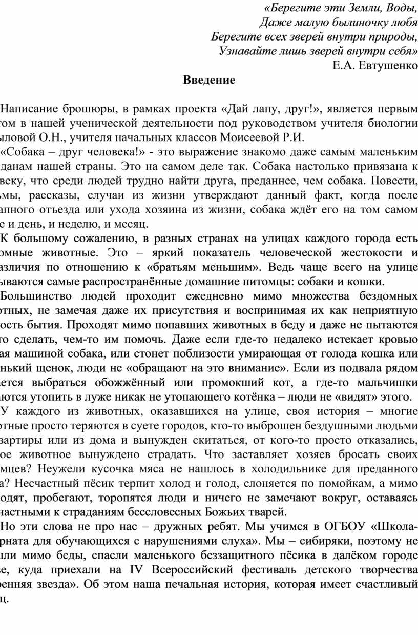 Написание брошюры, в рамках проекта «Дай лапу, друг!», является первым опытом в нашей ученической деятельности под руководством учителя биологии Копыловой О.Н., учителя начальных классов Моисеевой Р.И.