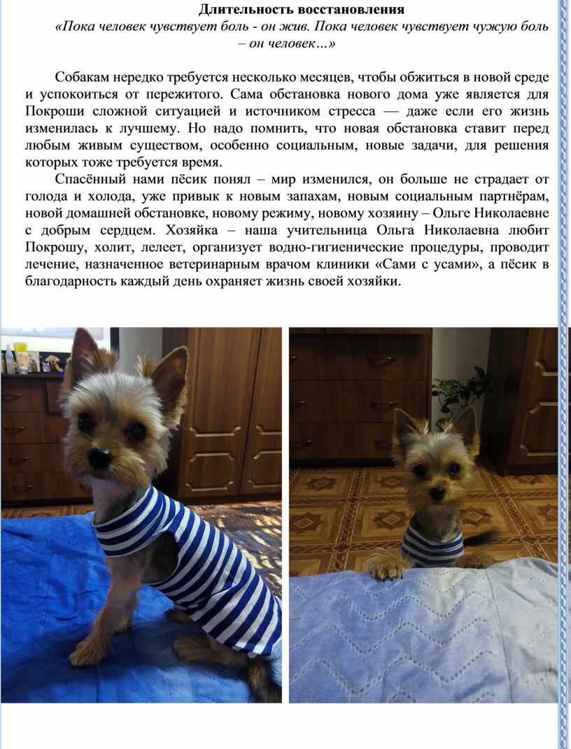 Спасённый нами пёсик понял – мир изменился, он больше не страдает от голода и холода, уже привык к новым запахам, новым социальным партнёрам, новой домашней обстановке, новому режиму, новому хозяину – Ольге Николаевне с добрым сердцем. Хозяйка – наша учительница Ольга Николаевна любит Покрошу, холит, лелеет, организует водно-гигиенические процедуры, проводит лечение, назначенное ветеринарным врачом клиники «Сами с усами», а пёсик в благодарность каждый день охраняет жизнь своей хозяйки.
