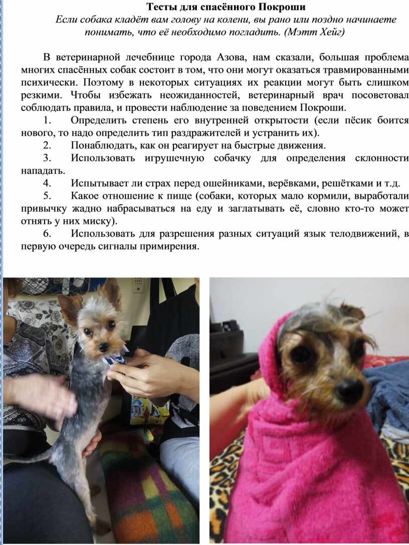 В ветеринарной лечебнице города Азова, нам сказали, большая проблема многих спасённых собак состоит в том, что они могут оказаться травмированными психически. Поэтому в некоторых ситуациях их реакции могут быть слишком резкими. Чтобы избежать неожиданностей, ветеринарный врач посоветовал соблюдать правила, и провести наблюдение за поведением Покроши.
