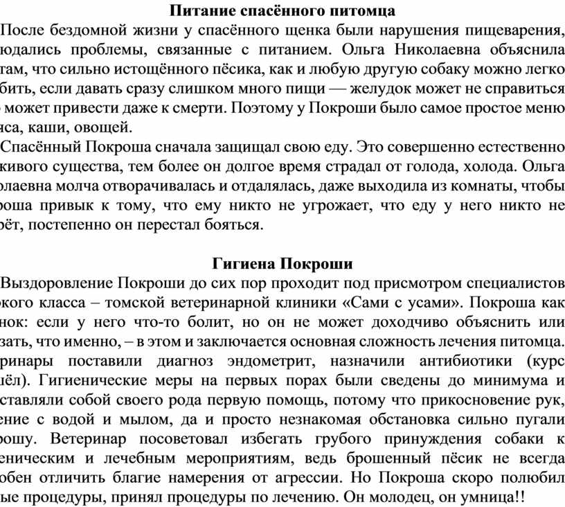 После бездомной жизни у спасённого щенка были нарушения пищеварения, наблюдались проблемы, связанные с питанием. Ольга Николаевна объяснила ребятам, что сильно истощённого пёсика, как и любую другую собаку можно легко погубить, если давать сразу слишком много пищи — желудок может не справиться – это может привести даже к смерти. Поэтому у Покроши было самое простое меню из мяса, каши, овощей.