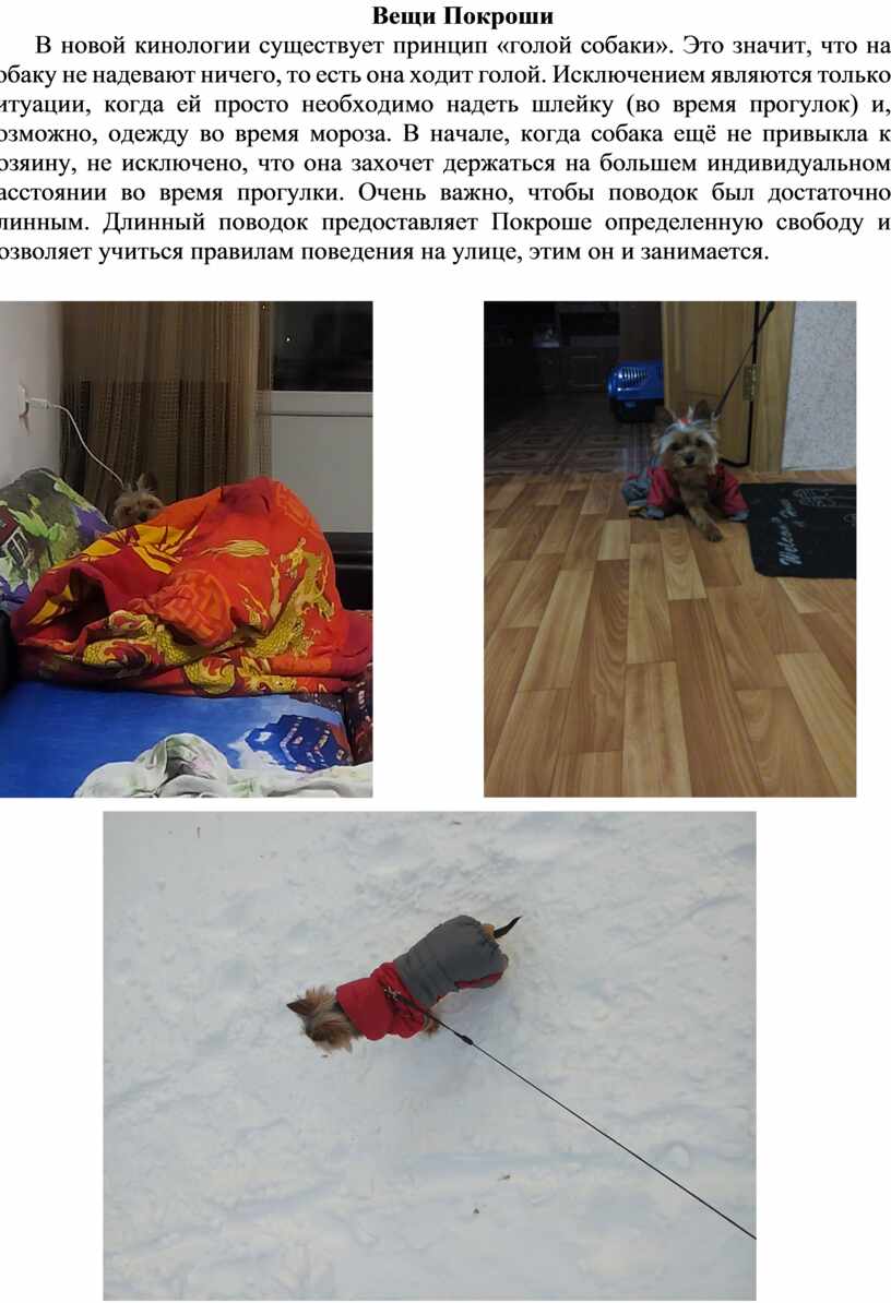 В новой кинологии существует принцип «голой собаки». Это значит, что на собаку не надевают ничего, то есть она ходит голой. Исключением являются только ситуации, когда ей просто необходимо надеть шлейку (во время прогулок) и, возможно, одежду во время мороза. В начале, когда собака ещё не привыкла к хозяину, не исключено, что она захочет держаться на большем индивидуальном расстоянии во время прогулки. Очень важно, чтобы поводок был достаточно длинным. Длинный поводок предоставляет Покроше определенную свободу и позволяет учиться правилам поведения на улице, этим он и занимается.