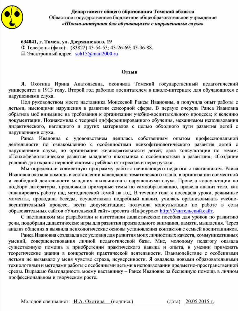 Я, Охотина Ирина Анатольевна, окончила Томский государственный педагогический университет в 1913 году. Второй год работаю воспитателем в школе-интернате для обучающихся с нарушениями слуха.