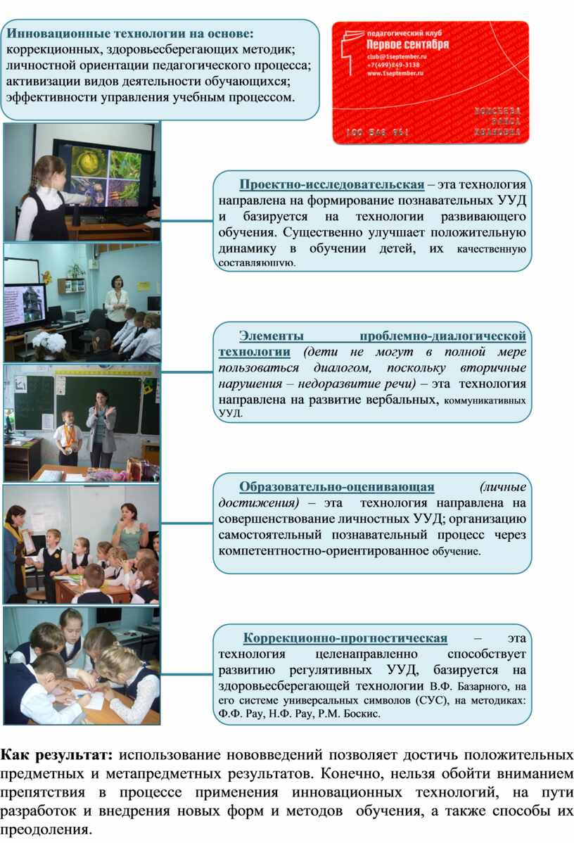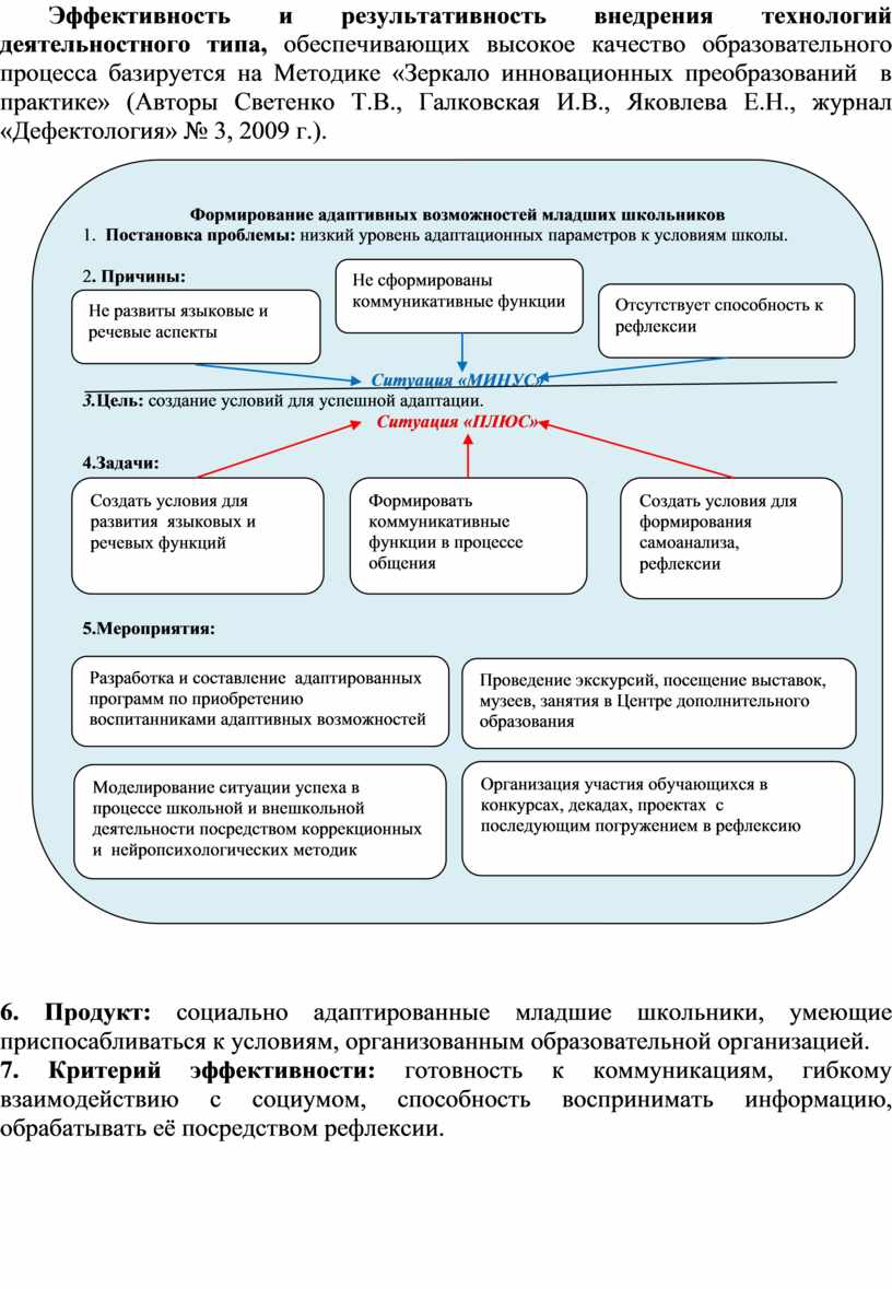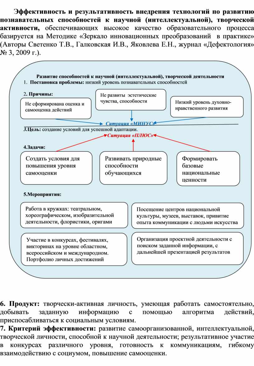 Эффективность и результативность внедрения технологий по развитию познавательных способностей к научной (интеллектуальной), творческой активности, обеспечивающих высокое качество образовательного процесса базируется на Методике «Зеркало инновационных преобразований в практике» (Авторы Светенко Т.В., Галковская И.В., Яковлева Е.Н., журнал «Дефектология» № 3, 2009 г.).